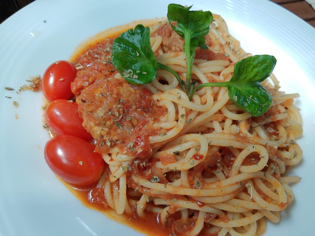 บรรยากาศชนะเลิศ อากาศเปิดแอร์แล้วไม่ร้อนไม่เย็น มีแสงแดดรำไร เหมาะเป็นที่พักใจยามเที่ยง เที่ยงมีคนบ้าง สงบพอใช้ มองไปข้างนอกเฉยๆ (มโนไปได้ว่ามีแค่ครูลุงป้าแก่ๆกับเด็กชายหัวเกรียน) โต๊ะส่วนใหญ่จัดเป็นร้านกาแฟมากกว่า โต๊ะกับเก้าอี้สูงไม่ต่างกันมากอาหารถ้าคิดว่าเป็น Cafe ก็ได้นะ สปาเก็ตตี้สไปซี่พอร์คบอล มาเร็วประมาณ 5-10 นาที เผ็ดที่สุดที่เคยกินสปาเก็ตตี้มา สัมผัสแรกคือกลิ่นออริกาโนฟุ้ง อาหารร้อน เส้นต้มนานไปนิดนึงเลยไม่ออดันเต้ (ความชอบส่วนบุคคล) มะเขือเทศน่าเสียดายเหมือนหลายวัน กลิ่นความสดหายไป ซอสดี พอร์คบอลเนื้อแน่นไม่แป้ง ผ่าน